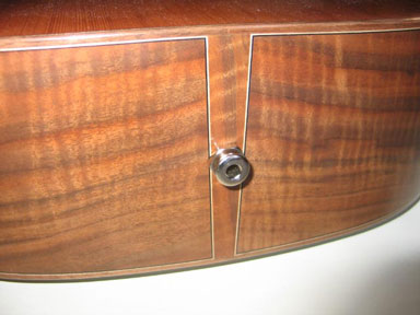 FINISHEach instrument is finished with the highest quality water-based gloss finish, and buffed to a mirror-like sheen. This type of finish closely resembles traditional lacquers in its ability to enhance wood grain and color, at the same time being less weather sensitive, and more user- and earth-friendly. PICKUPSMy instruments utilize the Highlander IP-2 pickup system. The IP-2 is a dual source device, consisting of an integral preamp, saddle transducer, and a jack within the body allowing the use of a small condenser microphone or a magnetic pickup. A stereo guitar chord routes the signals from the transducer and a second source (a microphone or magnetic pickup) to an external mixer or blender. The blending of the microphone signal with the transducer signal can produce more of a "live" sound than that of a transducer alone.
